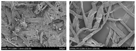 SEM images of individual fibers at 250× magnification are shown in Figure 2. As can be seen, the Kraft pulp exhibits long fibers with straight or kinked shapes. Compared with the organosolv fibers, the Kraft fibers show only few objects below 100 µm and a smooth fiber surface. The organosolv fibers in comparison exhibit shorter fibers and more inhomogeneous fiber surfaces. In particular, the presence of sphere-shaped objects with varying size on the surfaces of the fibers can be noted. These spheres have been identified as lignin particles, which stem from reprecipitation from the cooking liquor [40]. The SEM images therefore support the conclusion drawn from the compositional changes in Table 1, i.e., reprecipitation of lignin occurring during solvent displacement and washing of the fiber fraction. Moreover, the qualitative images are in agreement with the observations made by the Fiber Tester device.