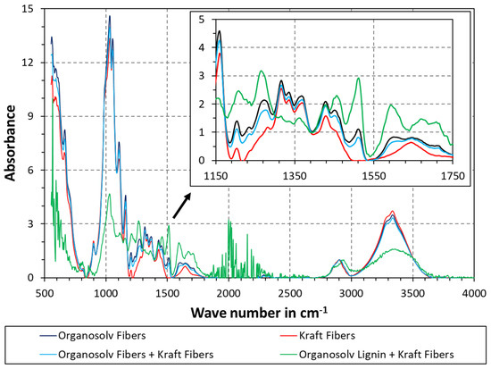 ATR-FTIR of thermopressed fiber materials. Each graph was baseline-corrected by a linear spline and normalized via the maximum of the C-H stretching band between 2800 and 3000 cm−1.