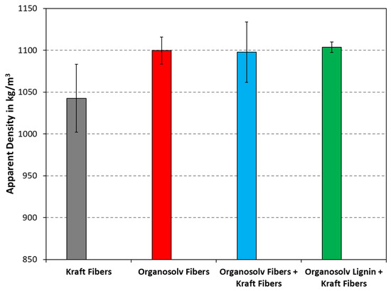 The densities of thermopressed fiber materials are plotted in Figure 5. As can be seen, the density of pure Kraft fibers appeared lower, whereas the products from organosolv pulping and their mixtures with Kraft pulp were similar. The latter contained technical lignin, be it from reprecipitation or addition, which can reportedly fill in cavities, thereby promoting a higher density [4]. Still, when performing the two-sided t-test with a confidence level of 95%, the zero hypothesis was rejected, i.e., the difference between the densities was not statistically significant.