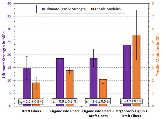 The outcome of tensile testing is displayed in Figure 6. Interestingly, the Kraft fibers alone yielded the lowest tensile strength of all tested samples. Kraft pulp is commonly used as reinforcement in applications such as cardboard and packaging. However, in this study, the pulp was not beaten before use. The beating of kraft pulp fibers affects the mechanical properties of handsheets [41]. Stiff fibers and the absence of secondary fines may therefore account for relatively poor bonding and hence a lower tensile strength, as compared to what could be achieved [42].