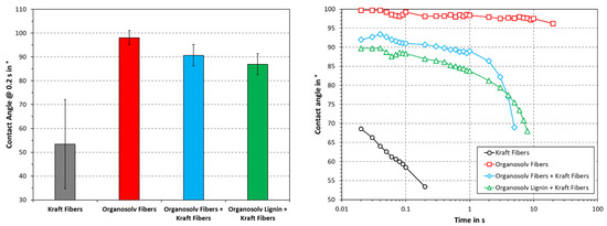 One of the challenges of cellulose-fiber-based materials is that these are prone to wetting. Water absorption can induce fiber swelling and interfere with inter-fiber adhesion, e.g., by decoupling hydrogen bonds. Paper and pulp products are hence deteriorated by the presence of water, as the cohesion within the fiber network is largely lost. Thermopressing can reportedly render such materials less hydrophilic, reducing fiber swelling and wetting [12]. The aqueous contact angle was therefore studied, as this provides a measure for the surface hydrophobicity and one-dimensional wetting. As can be seen in Figure 7, the lowest contact angle was obtained by Kraft fibers alone. Organosolv fibers, on the other hand, exhibited the highest and most stable contact angle. A combination of dense surface and residual lignin on the fibers (see Figure 2 and Figure 3) could likely be an explanation for this. The addition of organosolv fibers or organosolv lignin to Kraft fibers increased the contact angle, as compared to Kraft fibers alone. Initially, the contact angle of Kraft fibers with organosolv fibers is greater, but at ≥4 s, the Kraft fibers with organosolv lignin show higher values. The hydrophilicity of bleached softwood Kraft likely counteracts the reduction in wetting of the organosolv products. Still, the organosolv fibers behaved like a hydrophobic material in this test (contact angle > 90°), which suggests a high potential for applications in moist conditions. Compared with mechanical pulp thermopressed in the same conditions (175 °C, 75 MPa), the contact angle of the Kraft fibers was significantly lower [12]. This difference is likely due to a difference in chemical composition, as the Kraft fibers are virtually lignin-free, whereas the mechanical pulp contained near-native amounts of lignin [3]. During thermopressing, high temperatures can yield a softening of the lignin, making it moldable. The absence of natural lignin hence appears to greatly reduce the ability of thermopressed substrates to withstand wetting.