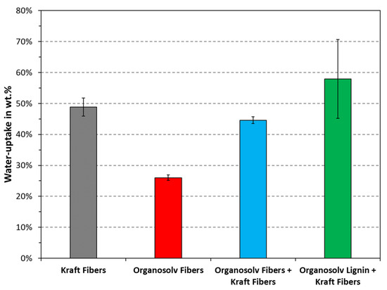 The water uptake quantifies the ability of a substrate to absorb water and swell, as opposed to the contact angle, which probes the surface hydrophobicity and one-dimensional mass transport. The measured water uptakes are plotted in Figure 8. Interestingly, this test showed that the water uptake for Kraft fibers with and without organosolv lignin was similar. Added lignin actually resulted in a higher value; however, no statistically significant difference was found when performing the two-sided t-test, even with a confidence level of . This would suggest that the lower hydrophilicity, as noted in Figure 7, was mainly due to the organosolv lignin providing a mass-transfer barrier. All other differences were found to be statistically significant at , except for comparing organosolv fibers + Kraft fibers with organosolv lignin + Kraft fibers. The lowest water uptake was noted for the organosolv fibers, followed by Kraft fibers with organosolv fibers. It appears that the materials formed by organosolv fibers are the least hydrophilic as documented by both contact angle and water uptake. It remains open whether this property arises from the inherent composition and properties of the fibers, or if this fiber type is particularly well suited for thermopressing.