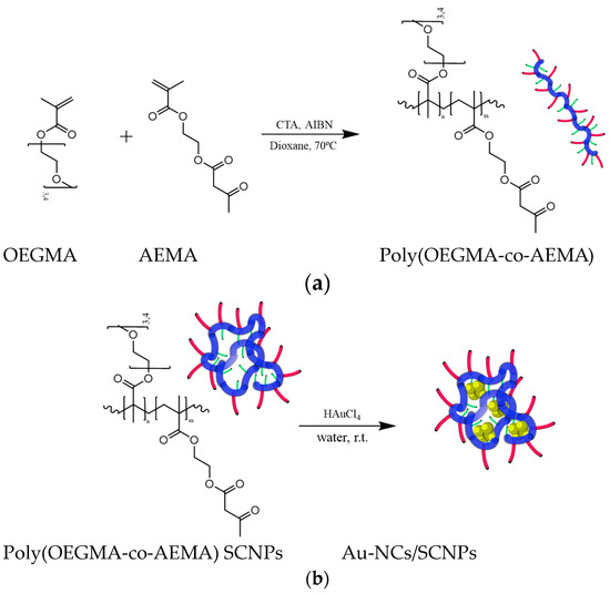 (a) Synthesis of an amphiphilic poly(OEGMA-co-AEMA) random copolymer featuring hydrophilic oligo(ethyleneglycol) methyl ether methacrylate (OEGMA) and hydrophobic (2-acetoacetoxy)ethyl methacrylate (AEMA) repeat units via reversible addition fragmentation chain-transfer (RAFT) polymerization. (b) Schematic illustration of the synthesis of Au-NCs/SCNPs from poly(OEGMA-co-AEMA) self-assembled in water in the form of SCNPs.