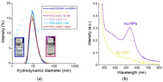 (a) DLS size distribution of poly(OEGMA-co-AEMA) SCNPs and Au-NCs/SCNPs. (b) Comparison of the UV-Vis spectra of Au-NPs synthesized in the presence of poly(OEGMA-co-AEMA) SCNPs at a (Au(III))/(beta-ketoester (AEMA)) ratio of 1 vs. Au-NCs synthesized within poly(OEGMA-co-AEMA) SCNPs at a (Au(III))/(beta-ketoester (AEMA)) ratio of 0.08 (see text).