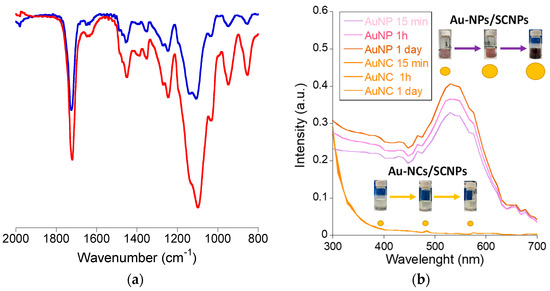 (a) IR spectra of neat poly(OEGMA-co-AEMA) SCNPs (blue color) and Au-NCs/SCNPs (red color). (b) Au-NPs synthesized in the presence of poly(OEGMA-co-AEMA) SCNPs at a (Au(III))/(beta-ketoester (AEMA)) ratio of 1 vs. Au-NCs synthesized at a ratio of 0.08.