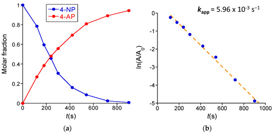 Figure 6a shows the evolution of the concentration of the reactant and the product over time as estimated from data in Figure 5c, and the corresponding calibration curves are provided in the Supporting Information. A reaction yield of 95% was achieved in 15 min. of reaction time, where the amount of 4-nitrophenol was totally consumed (see Figure 5c). As illustrated in Figure 6b, the apparent kinetic constant (kapp) of the reaction was estimated to be kapp = 5.96 × 10−3 s−1, which is a value between those reported by Yamamoto et al. for N,N-dimethylformamide-stabilized Au-NCs (kapp ≈ 3 × 10−3 s−1) and atomically monodisperse glutathione-stabilized Au-NCs (kapp ≈ 8 × 10−3 s−1) [28].