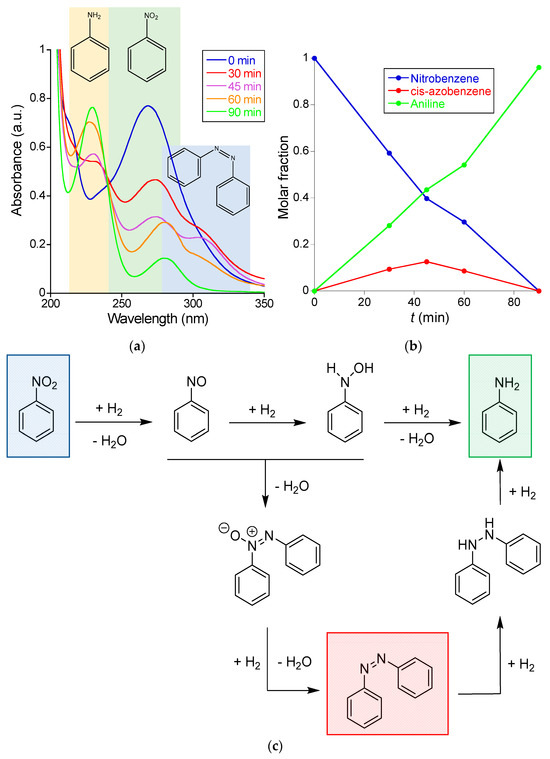 (a) Kinetics of the reduction of nitrobenzene to aniline catalyzed by Au-NCs/SCNPs as determined by UV-Vis spectroscopy. (b) Evolution of the concentration of nitrobenzene (blue), cis-azobenzene (red) and aniline (green) over time during the reduction of nitrobenzene to aniline catalyzed by Au-NCs/SCNPs. (c) Experimental data point to the involvement of both the direct route (upper) and the condensation route (bottom) mechanisms.