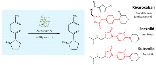 Motivated by the high conversion observed during the Au-NCs/SCNPs-catalyzed reduction of both 4-nitrophenol and nitrobenzene, we additionally investigated the reduction of 3-(4-nitrophenyl)-1,3-oxazolidin-2-one to 3-(4-aminophenyl)-1,3-oxazolidin-2-one catalyzed by Au-NCs/SCNPs. In this sense, the aminophenyl–oxazolidinone fragment is a common motif contained in several drugs like Rivaroxaban, Sutezolid, and Linezolid (see Figure 8).