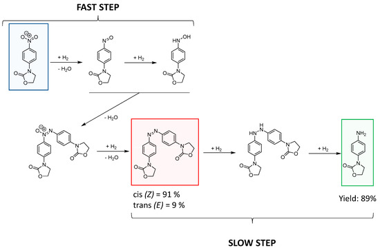 Reduction of 3-(4-nitrophenyl)-1,3-oxazolidin-2-one (in blue) to 3-(4-aminophenyl)-1,3-oxazolidin-2-one (in green) catalyzed by Au-NCs/SCNPs. The fast step corresponds to the formation of the diazene intermediate (in red), and the slow step to the generation of the aminophenyl-oxazolidinone product.
