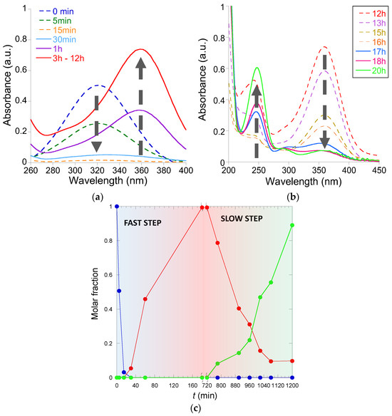 Kinetics of the reduction of 3-(4-nitrophenyl)-1,3-oxazolidin-2-one to 3-(4-aminophenyl)-1,3-oxazolidin-2-one catalyzed by Au-NCs/SCNPs as determined by UV-Vis spectroscopy corresponding to the fast step (a) and the slow step (b) of the reaction, as well as evolution of the concentration of 3-(4-nitrophenyl)-1,3-oxazolidin-2-one (blue color), (Z)-3,3′-(diazene-1,2-diylbis(4,1-phenylene))bis(oxazolidin-2-one) (red color), and 3-(4-aminophenyl)-1,3-oxazolidin-2-one (green color) over time (c).