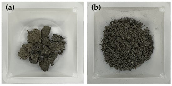 Freeze crushing PCR plastic. (a) PCR plastic raw materials and (b) PCR plastic material after 2 mm mesh freeze crushing.