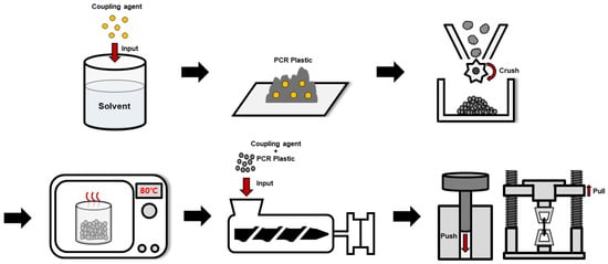 The rPP and rPE were purchased from Sarom ENG (Hwaseong, Republic of Korea). The film-based PCR plastic used in this study was provided by Cheongsol CNT Co., Ltd., (Goyang, Republic of Korea). The PCR plastic was crushed into 2 mm particles using a freezer mill (Universal cutting mill, Taemyung Science, Uiwang, Republic of Korea) before being used. The raw PCR plastic and the 2 mm crushed PCR plastic are depicted in Figure 1. Table 1 shows the characteristics and sources of the commercial coupling agents applied to rPP and rPE, and Table 1 shows the characteristics and sources of the commercial coupling agents applied to rPP, rPE, and the PCR plastic. MA and dicumyl peroxide (DCP) were purchased from Sigma Aldrich (St. Louis, MO, USA) in the USA. Graphene with an average particle size of 100–300 μm was obtained from New Graphene World (Hwaseong, Republic of Korea). Figure 2 shows an overview of the preparation process for the PCR plastic specimens with the application of coupling agents. Table 2 shows the content of MA, DCP, and graphene applied to the PCR plastic. First, the commercial coupling agents and graphene were directly applied to the PCR plastic without any treatment. MA and DCP were dissolved in a solvent at the concentrations indicated in Table 2 to prepare the MA coupling agent. After evaporating the solvent, the MA coupling agent was mixed with rPP, rPE, and the PCR plastic. The mixture was then crushed into 2 mm particles using a cryogenic grinder. To remove moisture from the crushed specimens, they were dried in a vacuum oven set at 80 °C for 2 h. The dried specimens were then molded into tensile specimens using a hot press set at 230 °C and a pressure of 500 bar.