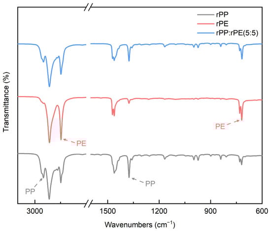Figure 3 shows the peaks of the reference rPP, rPE, and the FT-IR spectra of the rPP:rPE (5:5) sample. The obtained peaks show the typical spectra of PP and PE [27]. The specific PP peaks are shown at 2950 and 1375 cm−1, and the specific PE peaks are shown at 2847 and 718 cm−1. The peaks at 2950 and 2847 cm−1 are intensive absorption bands due to the symmetrical and asymmetric stretching vibrations of the C–H bonds such as CH2 and CH3. The peak at 1375 cm−1 is assigned to the CH2 and CH3 transformation oscillations of aliphatic groups in the polymer chain. The peak at 718 cm−1 is associated with the rocking vibrations of PE macromolecules [28,29,30,31,32]. Compared to the reference peak, at the rPP:rPE (5:5) sample, the characteristic peaks of rPP and rPE are shown. In particular, the 2950 cm−1 peak of the rPP:rPE (5:5) sample shows that PE is affected by PP. The values of the areas of the said peaks compared by a quantitative analysis are shown in Table 3, and the content of the rPP:rPE (5:5) sample was calculated by comparing these areas. The content was approximately 48.75% PP and 51.25% PE. Considering errors in the dispersion process, the ratio of rPP to rPE was close to 5:5.
