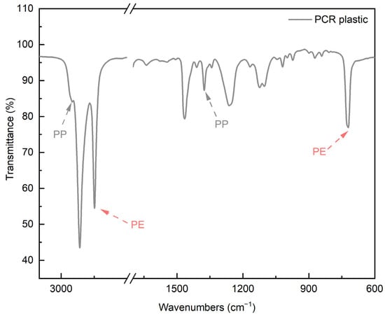 FT-IR spectra were measured using Thermo Fisher Scientific’s FT-IR Nicolet iS50 (Waltham, MA, USA) spectrometer in reflectance mode. The spectra were acquired using the Attenuated Total Reflection (ATR) technique, which measures the reflectance infrared spectra. Spectra were recorded in the wavenumber range of 550–4000 cm−1 with a spectral resolution of 8 cm−1 and averaged over 16 scans. A quantitative analysis of the area under the measured FT-IR spectra was performed to determine the content of PP and PE in the PCR plastic as well as the grafting ratio of the coupling agent.