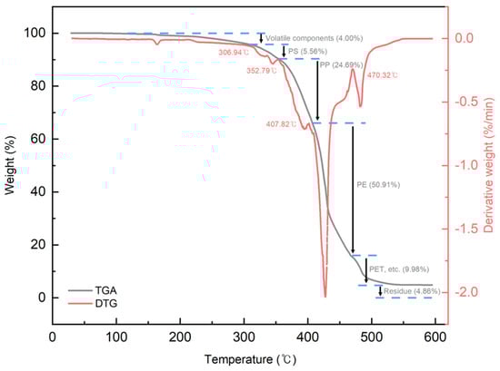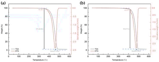 Figure 4 shows the FT-IR spectrum of the PCR plastic. In the FT-IR measurement results of the PCR plastic, specific peaks of PP and PE can be observed at the same positions, as shown in Figure 3. The contents of PP and PE were quantitatively analyzed by comparing the areas of the rPP, the rPE, and the PCR plastic, which revealed that the PCR plastic contained 28.95% PP and 71.05% PE, approximately in a ratio of 3:7. Figure 5 shows the results of the TGA and derivative thermogravimetric (DTG) measurements of the rPP and rPE. The DTG graph in (a) shows that the rPP started degradation at 351.06 °C, with maximum degradation occurring at 459.78 °C. The DTG graph in (b) shows that the rPE started degradation at 41.17 °C, with maximum degradation occurring at 475.41 °C. Both samples showed 1.94% and 2.30% of heterogeneous substances after degradation, respectively. Figure 6 shows the results of the TGA and DTG measurements of the PCR plastic. The degradation of PP and PE in the PCR plastic started at a temperature similar to the degradation temperature observed in Figure 5, according to the DTG results. The degradation of PP resulted in a weight loss of 24.69%, while the degradation of PE resulted in a weight loss of 50.91%. The FT-IR and DTG results confirmed the components within the PCR plastics in similar ratios. The thermal degradation temperature and content of the heterogeneous substances are crucial factors to consider due to the typical mixture of various materials in PCR plastics. The persistence of aluminum foil, even after complete thermal degradation, allows for residue measurement. Polyolefins were reported to undergo degradation within a temperature range of 300–500 °C in a study by Korol et al. [33]. Specifically, PP tends to degrade around 440–460 °C, while PE degrades around 460–475 °C [34,35,36,37]. Consistent with these findings, the observed thermal degradation of the PCR plastic confirms the presence of PP and PE. It has been reported that the residue content is usually less than 1 wt% when virgin polyolefins are completely degraded [38,39]. However, in the case of the PCR plastic, a residue content of 4.86% is observed. This higher residue content suggests that the properties of the PCR plastic may be lower compared to virgin plastics [40].