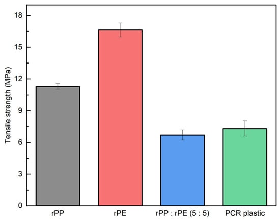 Figure 7 shows the tensile strengths of the rPP, rPE, rPP:rPE (5:5), and PCR plastic samples. The tensile strengths of the rPP and rPE were measured at 11.28 MPa and 16.63 MPa, respectively. In contrast, the tensile strength of the simply mixed rPP:rPE (5:5) sample was measured to be 6.70 MPa, while the PCR plastic exhibited a strength of 7.31 MPa. Figure 4 shows that the ratio of PP to PE in PCR plastics is approximately 3:7. However, the ratio of PP to PE is 5:5. In general, PCR plastics exhibit various ratios of PP and PE contents, such as 1:9, 2:8, and 3:7. In this experiment, we chose a representative 5:5 ratio to analyze. The recycling process for PCR plastic uses a mixture of different materials. Therefore, it is lower than the mathematically expected result obtained by simple mixing, as shown in Figure 7. Although PP and PE share similar hydrocarbon structures, they are thermodynamically immiscible, resulting in the formation of a binary system that compromises the strength [41,42]. Most PCR plastics consist not only of PP and PE but also a mixture of other plastics such as PET and PS. Instances of low strength due to immiscibility among different materials can be found in various other cases as well [43,44]. This makes it difficult to use the PCR plastics, so improving their strength is essential for expanding the applications of PCR plastics.