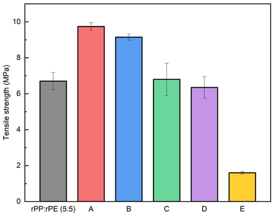 As previously mentioned, PP and PE, despite sharing a similar hydrocarbon structure, do not thermodynamically mix and form a binary system. To enhance the material properties, a coupling agent was applied. The coupling agent provides strong interfacial interactions for property enhancement, offers the possibility of chemical bonding, and improves stress transfer and interfacial adhesion, thereby inhibiting material delamination and improving properties. Therefore, the application of a coupling agent can greatly enhance the performance of binary plastic systems [45,46,47]. Figure 8 shows the tensile strength results of the rPP:rPE (5:5) sample with 5 wt% of commercial coupling agents. Commercial coupling agents, labeled as A to E in Table 1, were used. Coupling agents A and B showed a significant increase in tensile strength, while no improvement was observed with C, D, and E. Particularly, coupling agent A exhibited an increase of approximately 45% with a tensile strength of 9.74 MPa. This was attributed to its higher grafting ratio (5 wt%), which improved the interfacial interaction between PP and PE compared to the other coupling agents.