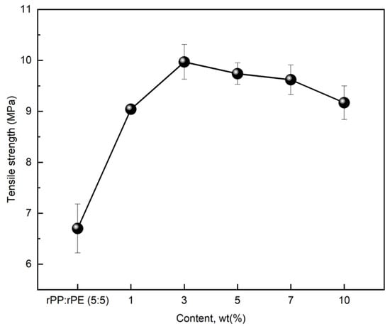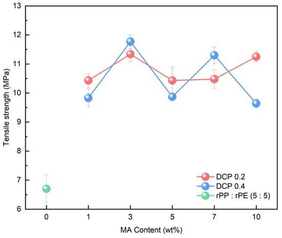 Tensile strength measurement results of rPP:rPE (5:5) sample with respect to the variation in the content of the MA coupling agent.