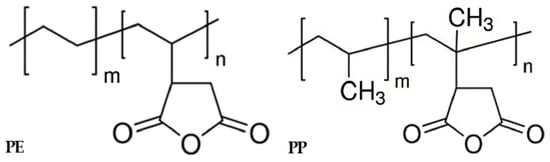 In addition to the commonly used methods of landfill and incineration, there are also methods of recycling plastic waste through simple recycling and mixing [14]. In general, plastic waste consists of a mixture of PP, polyethylene (PE), polyethylene terephthalate (PET), and other materials that are incompatible with each other due to differences in their polarity, resulting in the formation of a multisystem. Therefore, it is challenging to achieve good physical properties through simple mixing [15]. Therefore, during the recycling process, the plastic loses its mechanical properties and melt flow index (MFI). In industrial applications, the MFI is important to consider due to the high production rates. In terms of process efficiency, MFI improvement is related to flowability, production rate, and miscibility [16,17,18]. The mechanical properties and MFI of plastics waste can be improved by using coupling agents [19,20]. Ahmadlouydarab et al. investigated the effect of polypropylene–graft–maleic anhydride (PP-g-MA) on the properties of recycled polyethylene terephthalate (rPET)/PP blends. As a result, the PP-g-MA exhibited improved compatibility and mechanical properties [21]. Tucker et al. investigated the effects of PP-g-MA and styrene–ethylene–butylene–styrene-grafted MA (SEBS-g-MA) on PP/nylon 6 blends. As a result, both coupling agents showed a positive effect on improving the mechanical properties of the PP/nylon 6 blends [22].
