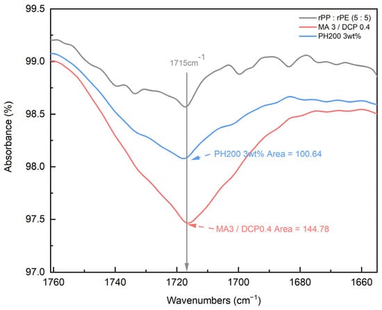 Coupling agent A exhibited the highest increase in tensile strength at 3 wt%. To compare the characteristics of coupling agent A with an MA coupling agent, we produced an MA coupling agent by adjusting the content of MA and DCP, requiring the identification of the optimal content, as shown in Table 2. The produced MA coupling agent was applied to the rPP:rPE (5:5) sample, and the tensile strength is depicted in Figure 11. The application of the MA coupling agent to the rPP:rPE (5:5) sample showed an observed improvement in tensile strength, surpassing coupling agent A for all content variations. Particularly, the highest enhancement was achieved with 3 wt% of MA and 0.4 wt% of DCP, which is the same content as coupling agent A. The difference in tensile strength between the MA coupling agent and coupling agent A can be determined by the grafting ratio measured through FT-IR. Figure 12 shows the grafting ratio difference in the rPP:rPE (5:5) sample for each coupling agent. The grafting ratio was determined by calculating the area under the peak observed at 1715 cm−1 [50]. The area for coupling agent A was measured to be 100.64, while for the MA coupling agent, it was measured to be 144.78. This discrepancy in area suggests a difference in grafting strength. Grafting strength ultimately determines the interfacial interaction strength, and a higher grafting ratio results in increased strength, ultimately leading to an improvement in tensile strength. As a result, the optimal content for the MA coupling agent was found to be 3 wt% of MAand 0.4 wt% of DCP, yielding the highest tensile strength and grafting ratio. Furthermore, unlike commercially available coupling agents that are typically produced with a fixed composition ratio, it can be concluded that the MA coupling agent exhibits optimized strength tailored to specific conditions that manufacturers may overlook by adjusting the appropriate ratio of MA and DCP and the synthesis conditions.