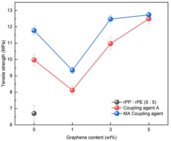 Changes in tensile strength of rPP:rPE (5:5) blend according to graphene content for coupling agent A and the MA coupling agent.