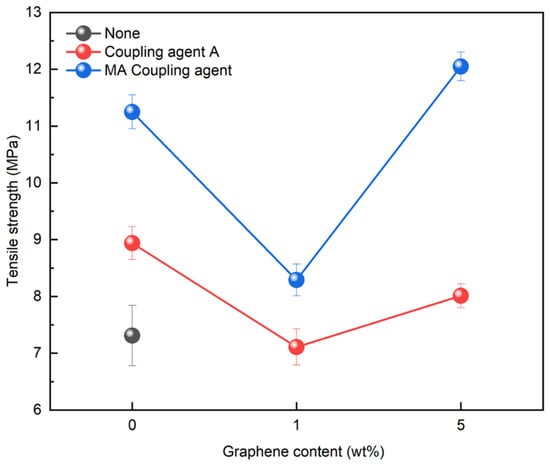 Graphene, with its strong inherent bonding, can be utilized to improve mechanical properties in various applications. Therefore, its optimal concentration was investigated by applying it to the rPP:rPE (5:5) blend. Figure 14 shows the variation in the tensile strength with the application of the coupling agent and the presence or absence of graphene. At 1 wt%, the tensile strength initially decreased; however, it reached its highest value when the graphene content reached 5 wt%. It is known that an excessive use of nanofillers such as graphene can have a negative effect on strength [54]. Therefore, graphene was applied at up to 5 wt% for the evaluation. The increase in tensile strength when applying the MA coupling agent and graphene was higher compared to coupling agent A. The effect of the graphene concentration on the PCR plastic was examined by comparing the 1 wt% and 5 wt% graphene concentrations. Figure 15 shows the changes in the tensile strength with the application of the coupling agent and the presence or absence of 1 wt% and 5 wt% of graphene. When applying the MA coupling agent and 1 wt% of graphene, a decrease similar to that for the rPP:rPE (5:5) blend was observed. At lower graphene concentrations, the interaction between graphene particles may be limited; however, as the concentration increases, the particles interact more closely and form stronger bonds with the polymer [55]. Therefore, an increase in tensile strength was observed when applying 5 wt% of graphene. However, when using coupling agent A, no significant increase in the tensile strength was observed. This can be attributed to the higher grafting ratio of the MA coupling agent, maximizing the crosslinking effect and achieving stronger bonding. The application of the high-grafting-ratio MA coupling agent combined with 5 wt% of graphene resulted in a significant improvement in the tensile strength of the PCR plastic. Figure 16 shows the thermal degradation temperature change of the PCR plastic in the presence of the MA coupling agent and graphene. The use of MA coupling agents and graphene increased the thermal degradation temperature of the PCR plastics. This indicates that the application of MA coupling agents improves the compatibility of PP and PE, resulting in improved thermal stability [56,57]. In addition, the high thermal conductivity of graphene improves its thermal stability within the polymer matrix [58,59,60]. The improvement in tensile strength and thermal stability is expected to broaden the applications of PCR plastics.