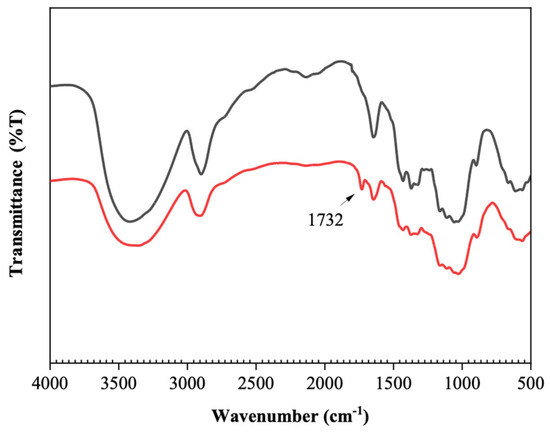 FTIR spectra of cellulose (black) and DAC (red) with a degree of oxidation of 40%, prepared at 25 °C and with an IO4− concentration of 1 mol/L.