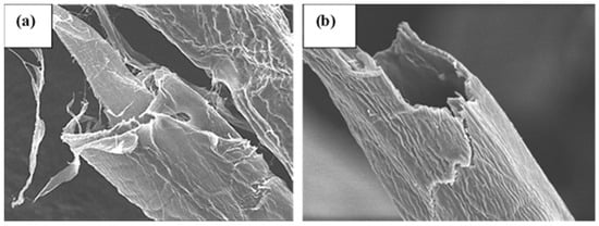 Scanning electron micrographs of fibers at a magnification of 2500: (a) pulp; (b) DAC with a degree of oxidation of 40%.