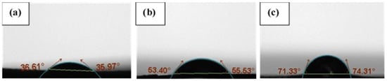 The contact angle of films made from DAC fibers prepared by oxidation for (a) 8 h, degree of oxidation = 24.5%; (b) 12 h, degree of oxidation = 32.5%; (c) 16 h, degree of oxidation = 40%.