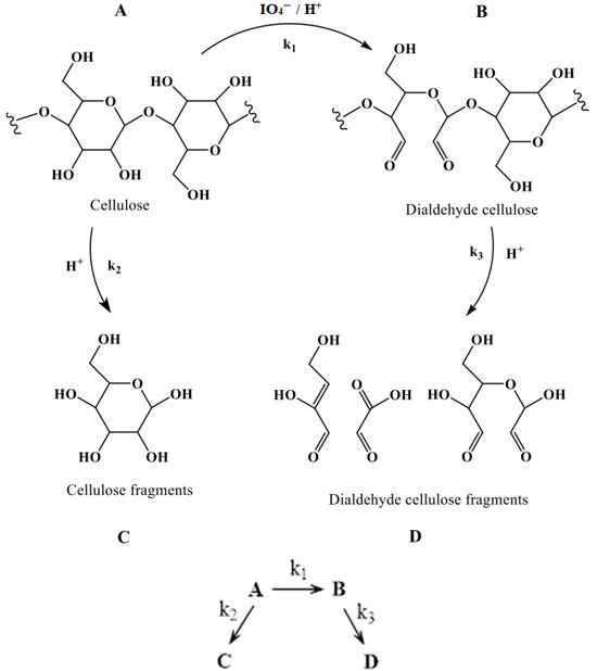 A schematic of periodate-mediated oxidation of cellulose. Parallel degradation reactions and associated rate constants occurring during cellulose oxidation. (A) Represents glucose units of a cellulose chain in the fiber, (B) represents 2,3-dialdehyde units of an oxidized cellulose chain, and (C,D) represent oligoglucans obtained by the degraded cellulose and dialdehyde cellulose, respectively.