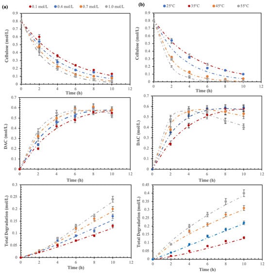 Time-variant experimental and model-predicted molar concentrations of cellulose, DAC, and total degradation (loss of fibers) under varying: (a) IO4− concentration (0.1–1.0 mol/L) at 25 °C; (b) temperature (25–55 °C) at 0.5 mol/L. Each dotted line represents the trends predicted by the model and each symbol represents an experimental data point.