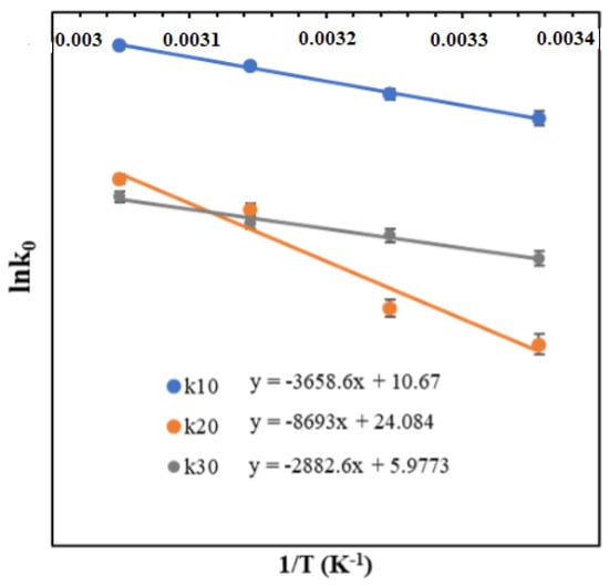 Temperature-dependent k10(T), k20(T), and k30(T) were determined along with the observed k1, k2, and k3 values, which were obtained from temperature-dependent DOEs. The calculated k10(T), k20(T) and k30(T) were fitted with the Arrhenius equation. The details of lnk10(T) versus 1/T and lnk20(T) and lnk30(T) versus 1/T are shown in Figure 6 and the corresponding Arrhenius equations for k10(T), k20(T), and k30(T) are given by Equations (5a)–(5c):