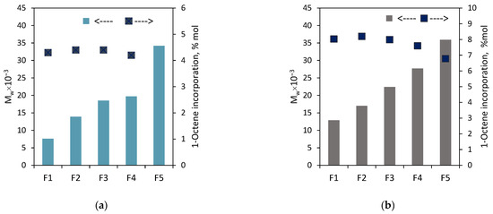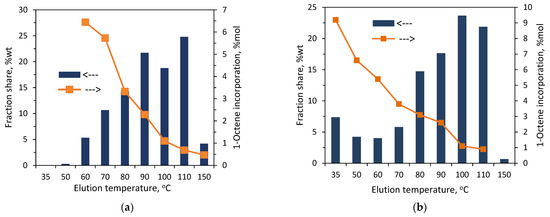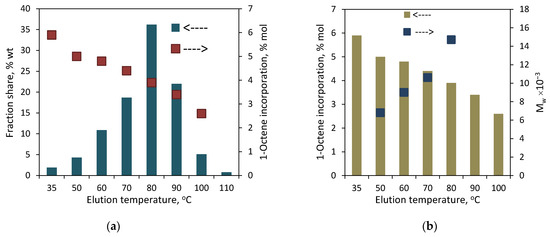 Matsko et al. [10] compared the profiles of the short-chain branching contents vs. molecular weights for ethylene/1-hexene copolymers synthesized over the supported Ziegler–Natta catalysts. The reported data showed a higher homogeneity of active sites in the vanadium–magnesium catalyst with respect to their copolymerization ability (despite a broader MWD) in comparison with the titanium counterpart. In turn, ethylene/1-octene copolymers, which were synthesized with the use of a constrained geometry catalyst, were found to have narrow composition distributions [9]. Interestingly, the molecular weights of the fractions derived from a copolymer with a lower comonomer content increased with the increasing elution temperature, while the molecular weights for the fractions coming from a copolymer with a higher comonomer content remained similar [9]. The studies of a series of 1-octene-based commercial Ziegler–Natta LLDPEs, which contained from 0.3 to 6.4 mol% of comonomer, revealed that the chemical compositions of the TREF fractions and their crystallinity are a function of the parent copolymer composition. Namely, the comonomer contents of similar TREF fractions increase with an increase in comonomer incorporation in the parent sample [21].