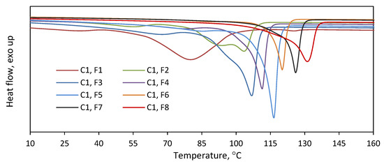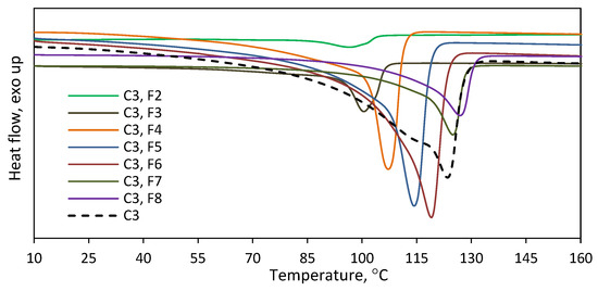 As is indicated by the above results, the copolymers were effectively separated into fractions with different comonomer contents. To check the homogeneity of the collected fractions, they were subjected to DSC analysis (Figure 4). The melting endotherms of all the fractions turned out narrower as compared to the endotherm of the parent copolymer (Figure S1). The fractions obtained at higher elution temperatures were homogeneous, with one narrow melting peak observed. In contrast, broader melting endotherms, also with multimodal patterns, were obtained for the fractions F1–F3. Moreover, the melting temperatures of the fractions were found to increase as a function of the elution temperature from F1 to F8. So, while the separation of macromolecules into fractions according to composition was not perfect, the subsequent fractions had significantly different compositions and thermal properties. The DSC analysis of the fractions of C2 gave similar results (Figure S2).