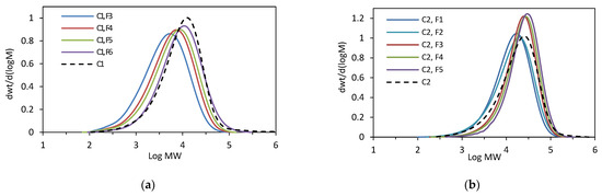 GPC curves: (a) for C1 and its fractions (F3–F6); (b) for C2 and its fractions (F1–F5).
