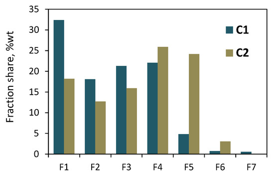 Both the copolymers that were synthesized with the zirconium complex were also subjected to solvent/non-solvent fractionation. The precipitation–dissolution procedure was repeated seven times, while the non-solvent content in the solvent/non-solvent mixture was varied between 90 and 0 vol%. Seven and six fractions were obtained for the C1 and C2 copolymers, respectively. The total mass of the collected fractions reached 93 wt% and 91 wt% of the initial mass of the sample of C1 and C2 subjected to fractionation. The results of the C1 fractionations (Figure 6 and Table S2) showed the highest share of the first fraction (32.4 wt%). The amounts of subsequent fractions (F2–F4) were similar, from 18 to 22 wt%, while the fractions F5–F7 had very small shares—within 0.5–4.8 wt%. In the case of C2, the shares of the fractions F1–F5 ranged from 12.7 wt% to 25.9 wt%, while the share for the fraction F6 was the lowest—it was equal to 3.1 wt%.