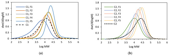 GPC curves: (a) for C1 and its fractions (F3–F5); (b) for C2 and its fractions (F1–F5).