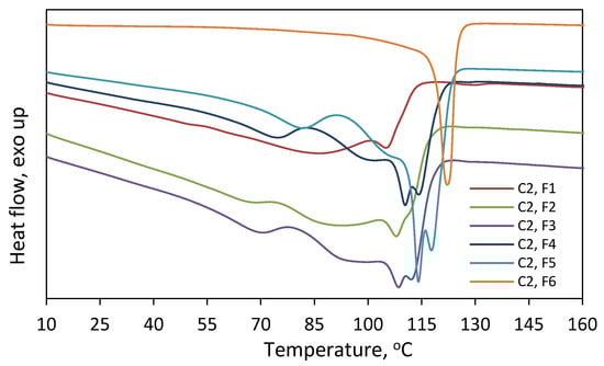 Thermograms recorded for fractions F1–F6 of C2 obtained after fractionation by molecular weight.