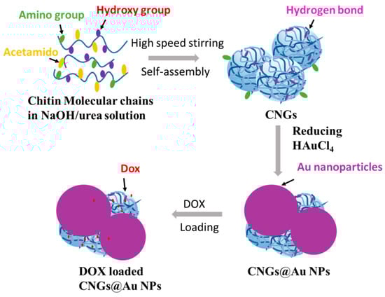 Chitin as a natural polymer has good biocompatibility and degradability, with a wide range of applications in drug release, wound dressings, tissue engineering, and other biomedical fields [,,]. Since chitin contains a small amount of amino groups, it can reduce metal ions in order to prepare metal particles []. Therefore, we used the chitin nanogel prepared in our previous work [] as a template to reduce chloroauric acid to generate AuNPs and immobilize them on the surface of chitin through the reducing effect of its amino group and its chelating effect (Figure 1). AuNPs with different sizes and morphologies have been applied in various fields, such as catalytic reactions [] and electrochemical bio-detection []; however, they affect the catalytic and optical properties of AuNPs. Therefore, the size tuning of AuNPs is a crucial consideration in their synthesis. In this study, we prepared AuNPs with different sizes and shapes by varying the reaction conditions, such as the concentration of chloroauric acid and temperature during the chitin nanogel reaction. The chitin nanogel/AuNP composites (CNGs@AuNPs) exhibiting the most pronounced plasmon resonance effect were selected. Then DOX was loaded into CNGs@AuNPs to explore their release behavior under different pH values, temperatures, and near-infrared light stimulations. Finally, the effect of CNGs@AuNPs as DOX drug carriers on hepatocellular carcinoma (HepG2) cells under NIR radiation was investigated via in vitro cellular experiments. This system combined chemotherapy and photothermal therapy to play a common role and is expected to be applied in cancer therapy.