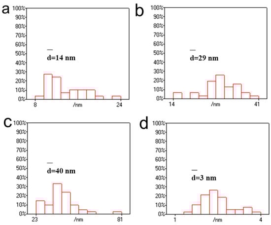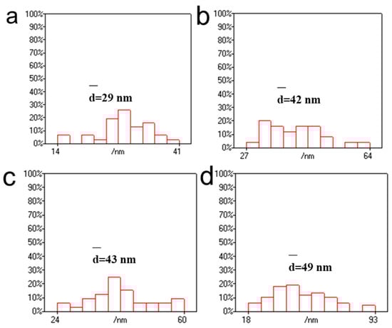 AuNPs prepared at 40 °C with a concentration of 1 mg/mL of chloroauric acid had more aggregates, resulting in a darker cyan-blue color. The particle size of AuNPs was then statistically analyzed using Nanomeasure 1.2 software. As shown in Figure 3, the particle sizes of AuNPs produced at 40 °C with different chloroauric acid concentrations of 0.25 mg/mL, 0.5 mg/mL, 1 mg/mL, and 1.5 mg/mL were distributed in the ranges of 8–24 nm, 14–41 nm, 23–81 nm, and 1–4 nm, with an average particle size of 14 nm, 29 nm, 40 nm, and 3 nm, respectively. At a reaction temperature of 40 °C, the particle size of AuNPs increased with a gradual increase in concentration when the concentration of the chloroauric acid was below 1 mg/mL. However, when the chloroauric acid concentration was 1.5 mg/mL, the particle size of AuNPs was only 3 nm. This small-sized gold nanoparticle has received much attention in recent years in the fields of chemical catalysis, bioimaging, etc. [,,]. In this experiment, we set the concentration of CNGs to 10 mg/mL, at which CNGs are more stable and do not aggregate or settle. Therefore, the concentration of chloroauric acid has a significant influence on the preparation of AuNPs. When the temperature was 40 °C, the size of the produced AuNPs increased with the increase in HAuCl4 concentration; however, the particle size of AuNPs was significantly reduced to 3 nm at 1.5 mg/mL of HAuCl4. At too low a concentration, the weak reducing property and the limited growth of crystals prevent the nanocrystals from reaching the saturation state of the system at the early stage of formation. There is also a possibility that when the concentration of chloroauric acid is low, the chitin molecular chains occupy the relative space for crystal growth, thus reducing the crystallinity of the crystals and hindering their growth. The formation of nanoparticles consists of two processes: the nucleation process of the crystals and the crystal growth. The nucleation process of the crystals is very rapid, while the crystal growth process is very slow []. In the concentration range of 0.25–1.0 mg/mL of HAuCl4, as the concentration of chloroauric acid increases, the particle size of the generated gold nanoparticles becomes larger. The reason for this is that after nucleation, with the further reduction of chloroauric acid, the Au crystal nuclei become larger and larger. An excessive concentration of HAuCl4 causes excessive nuclei to be formed at the initial stage in solution, forming nanoparticles dominated by fine particles. When the concentration of HAuCl4 was 1.5 mg/mL, too many nuclei were formed in the initial stage, and the consumption of amino was also relatively high. A large quantity of precursors and reducing agents was consumed in the nucleation stage; as a result, the growth rate of seeds was decelerated, which limited the size of the generated AuNPs [].
