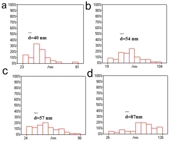 Statistical size distributions of AuNPs produced with different concentrations of HAuCl4 at 40 °C: (a) 0.25 mg/mL, (b) 0.5 mg/mL, (c) 1 mg/mL, and (d) 1.5 mg/mL.