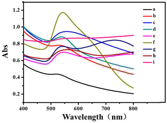 AuNP absorption depicts surface plasmon resonance absorption, which is closely related to the motion of free electrons on the metal surface []. When an electromagnetic wave acts on the surface of AuNPs, the surface plasma oscillates, and resonance occurs when the frequency of the electromagnetic wave is the same as the frequency of the plasma oscillation [,]. At the macroscopic level, this resonance manifests itself in the absorption of light by AuNPs.
