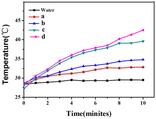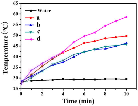 The use of AuNPs combined with anti-cancer drugs for cancer treatment is mainly based on the photothermal effect of AuNPs. By applying the photothermal material to the cancer site, the temperature increase under the stimulation of near-infrared light can kill the cancer cells. On the other hand, it can also stimulate the release of drugs from the material, playing a joint role in chemotherapy and photothermal therapy. Therefore, an evaluation of the photothermal effect of the drug carrier CNGs@AuNPs is needed prior to the controlled drug release investigation, with the aim of exploring whether CNGs@AuNPs can generate higher temperatures under the stimulation of an NIR light source for a short period of time, which in turn induces the temperature-responsive behavior of the polymer layer and realizes the NIR light-stimulated release of the drug.