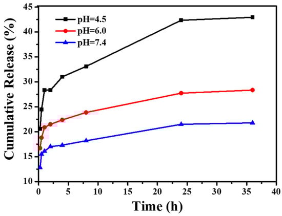 A water-soluble anti-tumor drug, DOX, was chosen as a model, and the drug loading capacity of CNGs@AuNPs was 21.8 mg/g. The pH of the cellular microenvironment in organisms varies, with most somatic cells usually in the range of 7.35 to 7.45. Tumor cells are usually weakly acidic due to their vigorous metabolism and tissue hypoxia. Therefore, it is necessary to explore the effect of pH on the controlled release of DOX from CNGs@AuNPs. Figure 11 demonstrates the DOX release from CNGs@AuNPs at 37 °C under different pH conditions. The release of DOX was slow at pH 7.4, but it gradually accelerated as the pH decreased. The presence of amino groups in chitin nanogels caused their surface to protonate with more positive charges at low pH. This property helped release the positively charged DOX faster, which could be beneficial for the release of antitumor drugs.