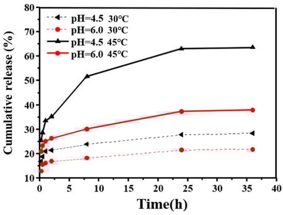 The photothermal effect of AuNPs not only kills cancer cells but also significantly affects the release of DOX from CNGs@AuNPs. Therefore, we explored the release of DOX from CNGs@AuNPs at pH 4.5 and 6.0 under temperatures of 30 °C and 45 °C, respectively. Figure 12 shows the effect of temperature on the cumulative release profiles of DOX from CNGs@AuNPs. The release of DOX from CNGs@AuNPs accelerated under elevated temperatures. Under the condition of 45 °C and pH 4.5, the cumulative DOX release rate was 65% at 36 h, while it was only 25% at 36 h under the condition of 30 °C and pH 4.5. This result lays the foundation for the photothermally controlled release of AuNPs. Since CNGs contain amino groups, they are protonated when the external pH is acidic, which causes a change in the electrostatic repulsion between functional groups. This leads to a greater solubility of the hydrogel, which in turn promotes the release of the drug from the system []. When the temperature increases, the release of the drug can be facilitated by the acceleration of the molecular Brownian farsightedness or solvation of the polymers [].