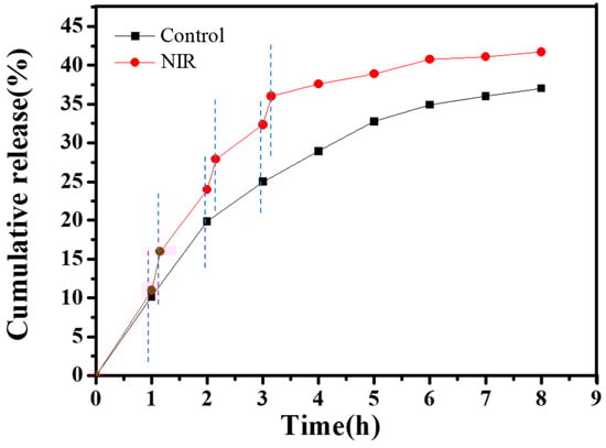 Finally, we investigated the effect of photo-responsiveness of CNGs@AuNPs obtained at a HAuCl4 concentration of 1.0 mg/mL at 120 °C on drug release by NIR radiation warming, as shown in Figure 13. The release medium was PBS buffer at pH 4.5. The black curve is the normal release group, which shows a cumulative DOX release rate of 37% in 8 h. CNGs@AuNPs were irradiated with 2 W/cm2 NIR light for 15 min at intervals of 1 h. The cumulative DOX release curves (red curve) obviously accelerated after radiation, obtaining a release rate of 42% at 8 h compared to 36% for the control group. The cumulative release rate of the control group was 36% at 8 h, and could reach 42% after NIR irradiation. As a kind of ambient temperature-sensitive drug-carrying system, CNGs@AuNPs could improve the antitumor effect of the drug by accelerating the drug release with an auxiliary NIR radiation.