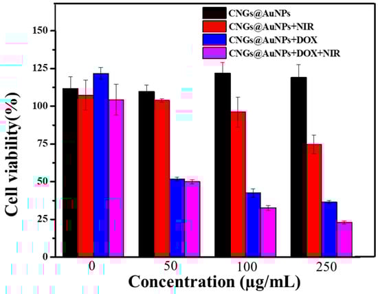 Finally, we investigated the inhibitory effects of CNGs@AuNPs and DOX-loaded CNGs@AuNPs on HepG2 cells with or without NIR radiation, as shown in Figure 14. The cell survival rates of different concentrations of CNGs@AuNPs with HepG2 cells were above 100% after 48 h of co-culture, indicating that CNGs@AuNPs alone have good biocompatibility in the absence of NIR radiation. After 5 min of 808 nm NIR radiation, the apoptosis rate gradually increased with the increasing concentration of CNGs@AuNPs. At a concentration of 250 µg/mL, the survival rate of HepG2 cells was 74.7%. This is because a high concentration of CNGs@AuNPs has a more significant photothermal effect, and the increase in temperature will cause the destruction of DNA and proteins in the nucleus of the cells, resulting in cell apoptosis. DOX-loaded CNGs@AuNPs showed good chemotherapeutic effects on cells without NIR radiation, and the cell survival rates of samples with concentrations of 50 µg/mL, 100 µg/mL, and 250 µg/mL were 51.7%, 42.5%, and 36.5%, respectively. After 5 min of NIR radiation, the temperature of the DOX-loaded CNGs@AuNP system with different concentrations increased accordingly. The increase in temperature led to apoptosis and also accelerated the rate of DOX release. Therefore, under the dual action of DOX chemotherapy and photohyperthermia, the cell survival rates of 50 µ g/mL, 100 µ g/mL, and 250 µ g/mL DOX-loaded CNGs@AuNP samples were reduced to 49.9%, 32.6%, and 22.9%, respectively. In summary, DOX-loaded CNGs@AuNPs under NIR radiation on HepG2 hepatocellular carcinoma cells can exert a combined co-effect of chemotherapy and photothermal therapy in vitro.