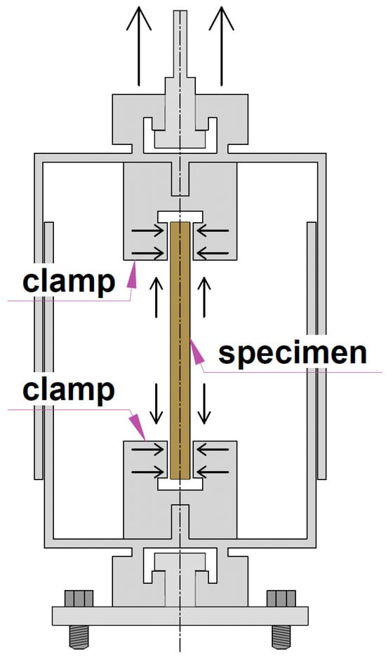 The chamber was installed on a Tinius Olsen h100ku machine (Tinius Olsen Ltd., Surrey, England) (characteristics were presented in previous studies [11,18,24]). The upper part of the camera (see Figure 1) was clamped in the grip of the machine and is able to slip freely relative to the lower part. Clamps had flexibility for turns, so bending moments from eccentricities did not occur in the sample, and it worked only for longitudinal force.