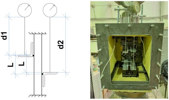 To increase the accuracy of determining the calculated length, the contact of the corner shelf with the sample along its length was minimized by inserting the spacer and making sure that the contact between the corner and the specimen was concentrated in one spot. The test scheme and the photo of the real installation are presented in Figure 2.