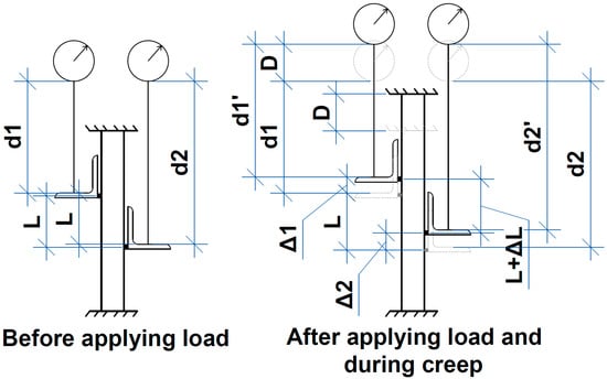 The sensor readings were recorded at zero force immediately after applying load and then with the steps of 1, 5, 10, 15, 30, and 60 min. They were transformed into span change using Formulas (1)–(7) (see Figure 3). Then, the strain was calculated by dividing the displacement by the initial span. As a result, creep curves were obtained (—time).